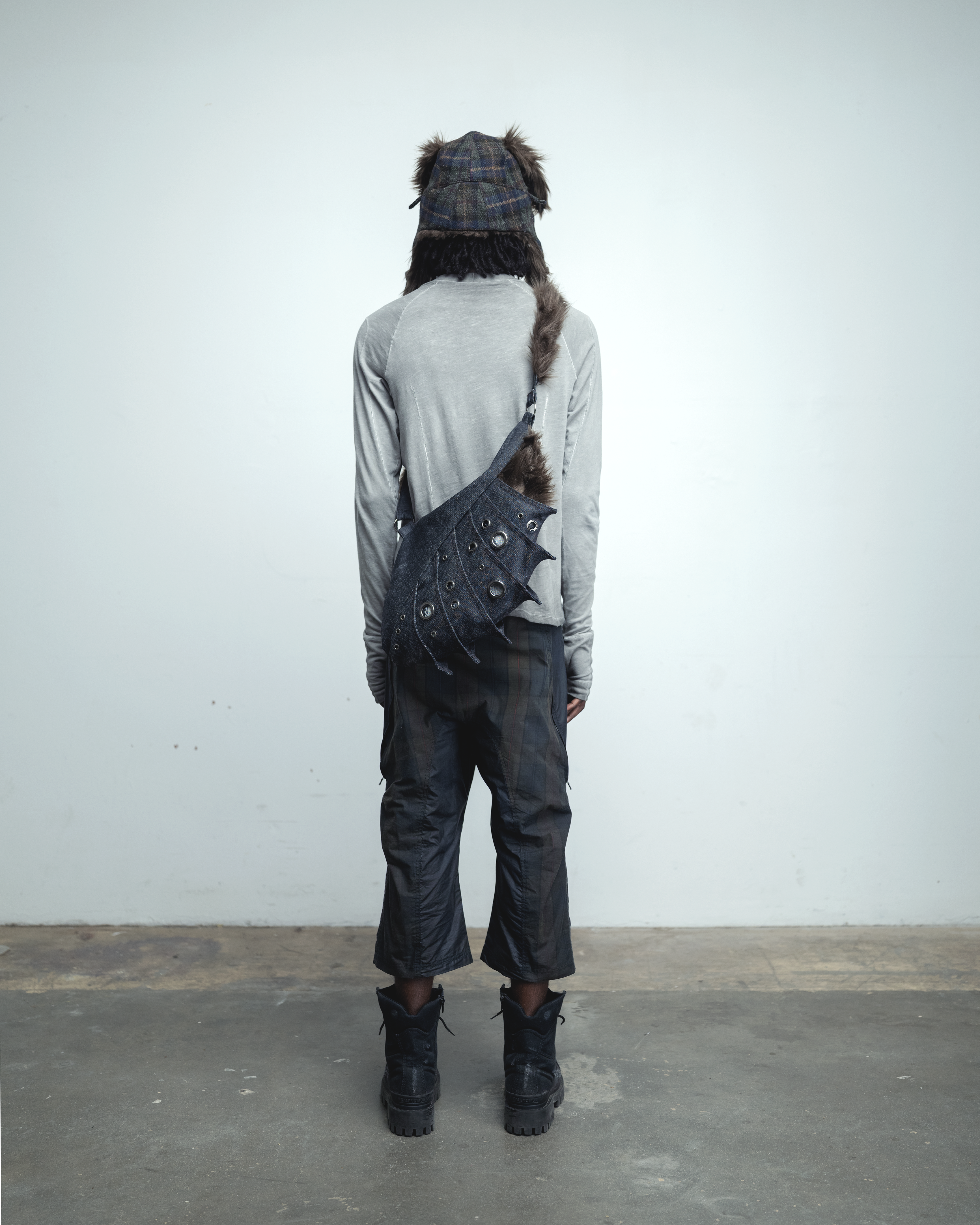 Denim crossbody bag inspired by the natural armor of a chiton, with segmented shaping that recalls an articulated form. Multiple grommets in various sizes punctuate the exterior, offering ornamental decor. The shape of each layered shell allows for the bag to slightly expand as more items are ingested.