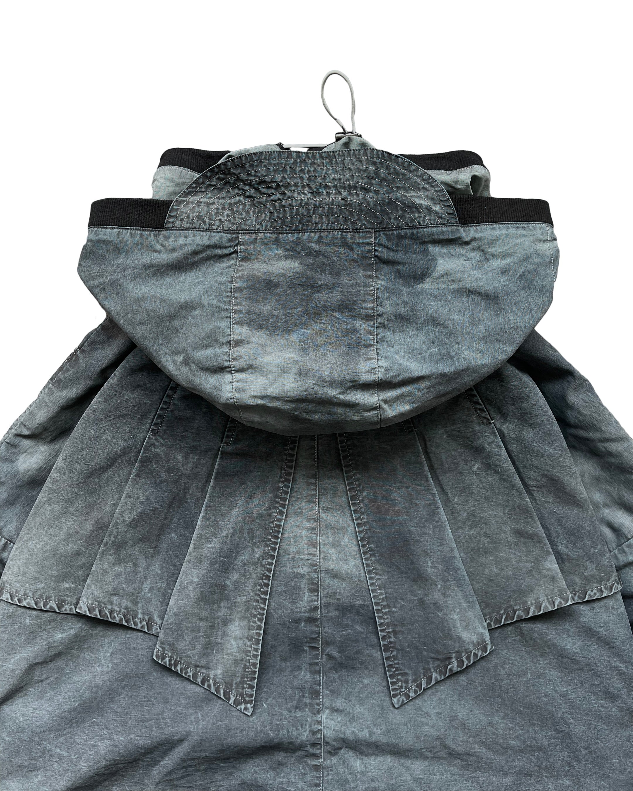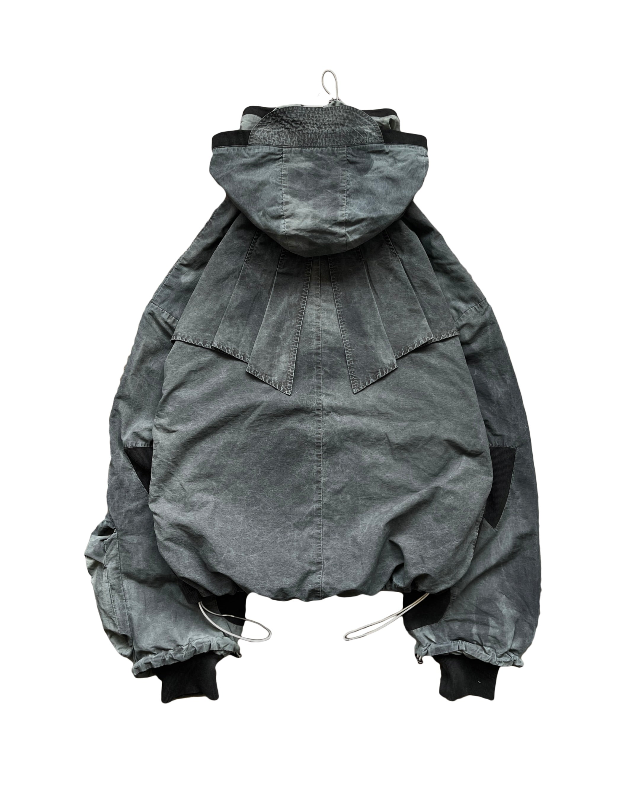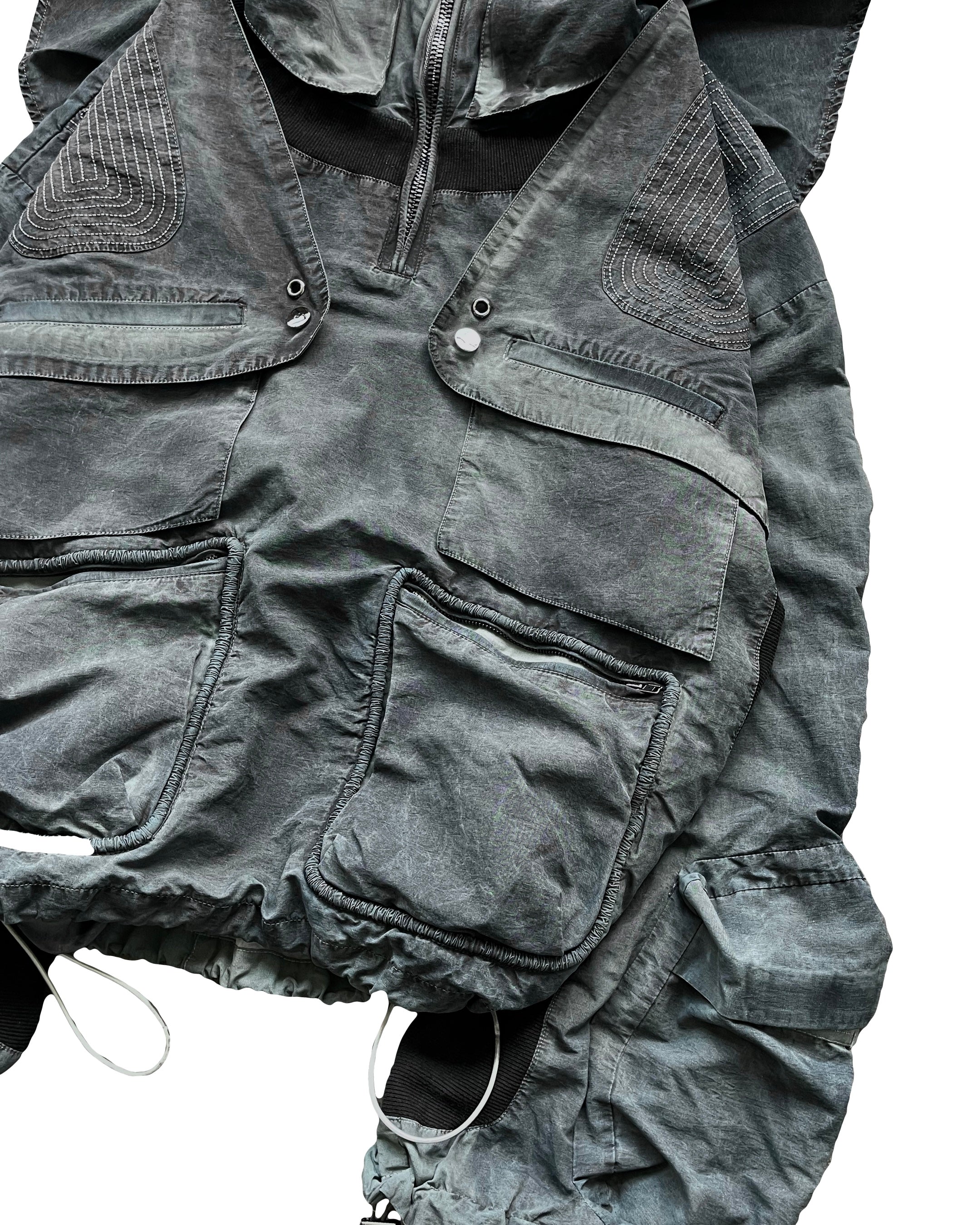 7-pocket quarter zip jacket. Fully adjustable cording throughout hems, hood, and sleeves. Ribbed cuffing and detail throughout entire shell. Nylon lining. Features piped seam detailing, layered vest paneling with snap closure, pleated wings, reverse 3D sleeve pocket, stitched shoulder patch, high neck collar, thumbholes and a brimmed hood. Finished with a hand pigmentation dye process in Los Angeles, CA and hand sewn label.
