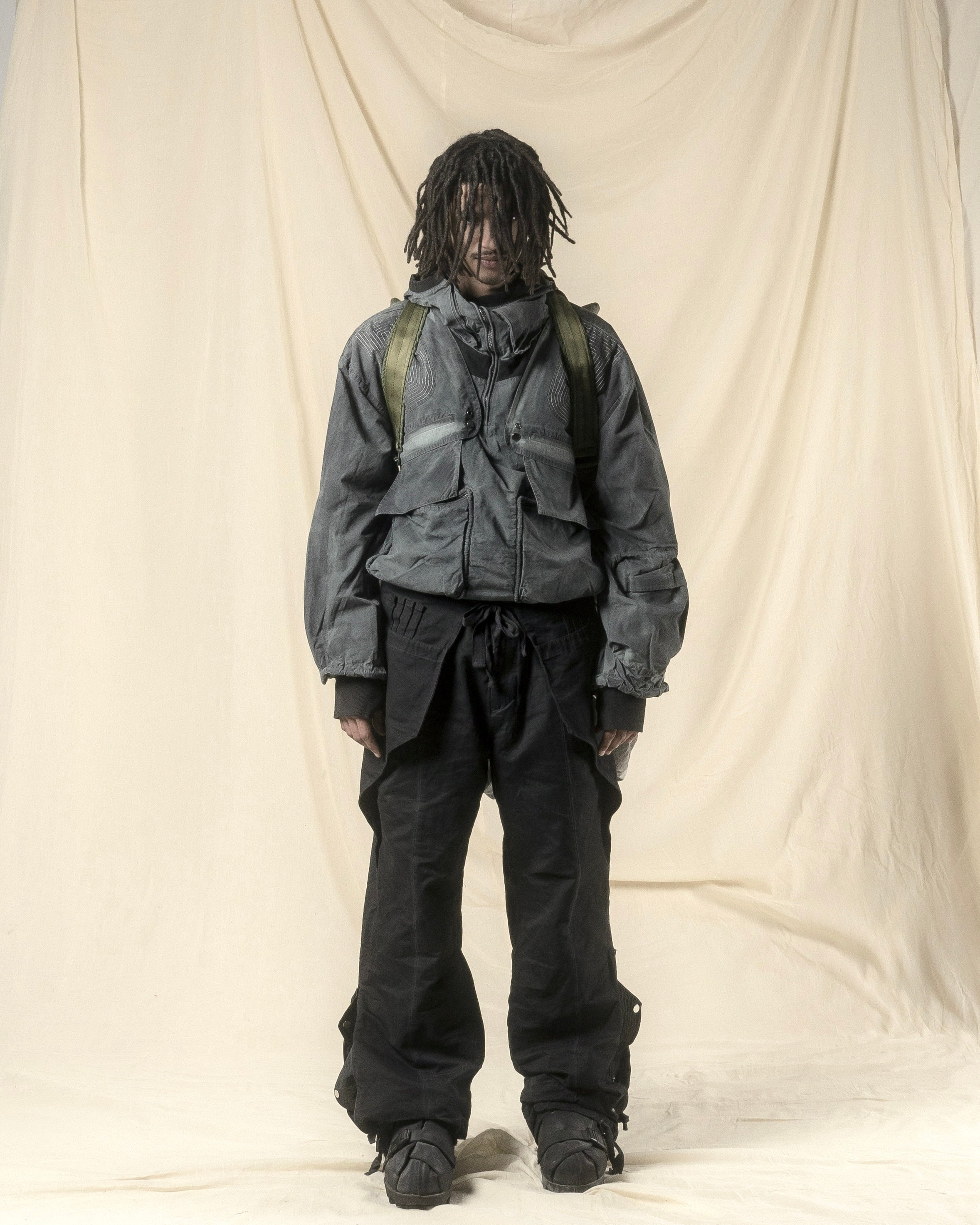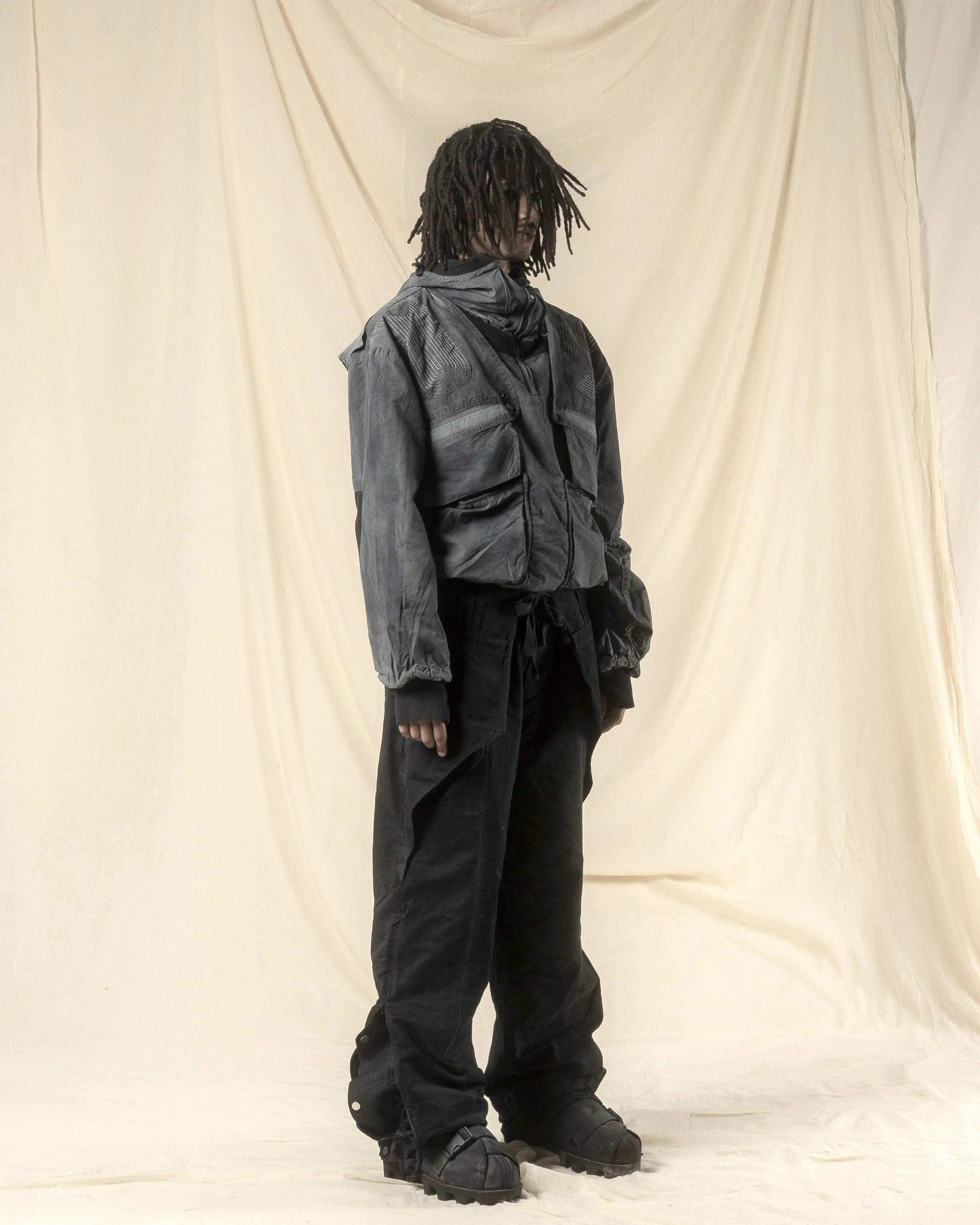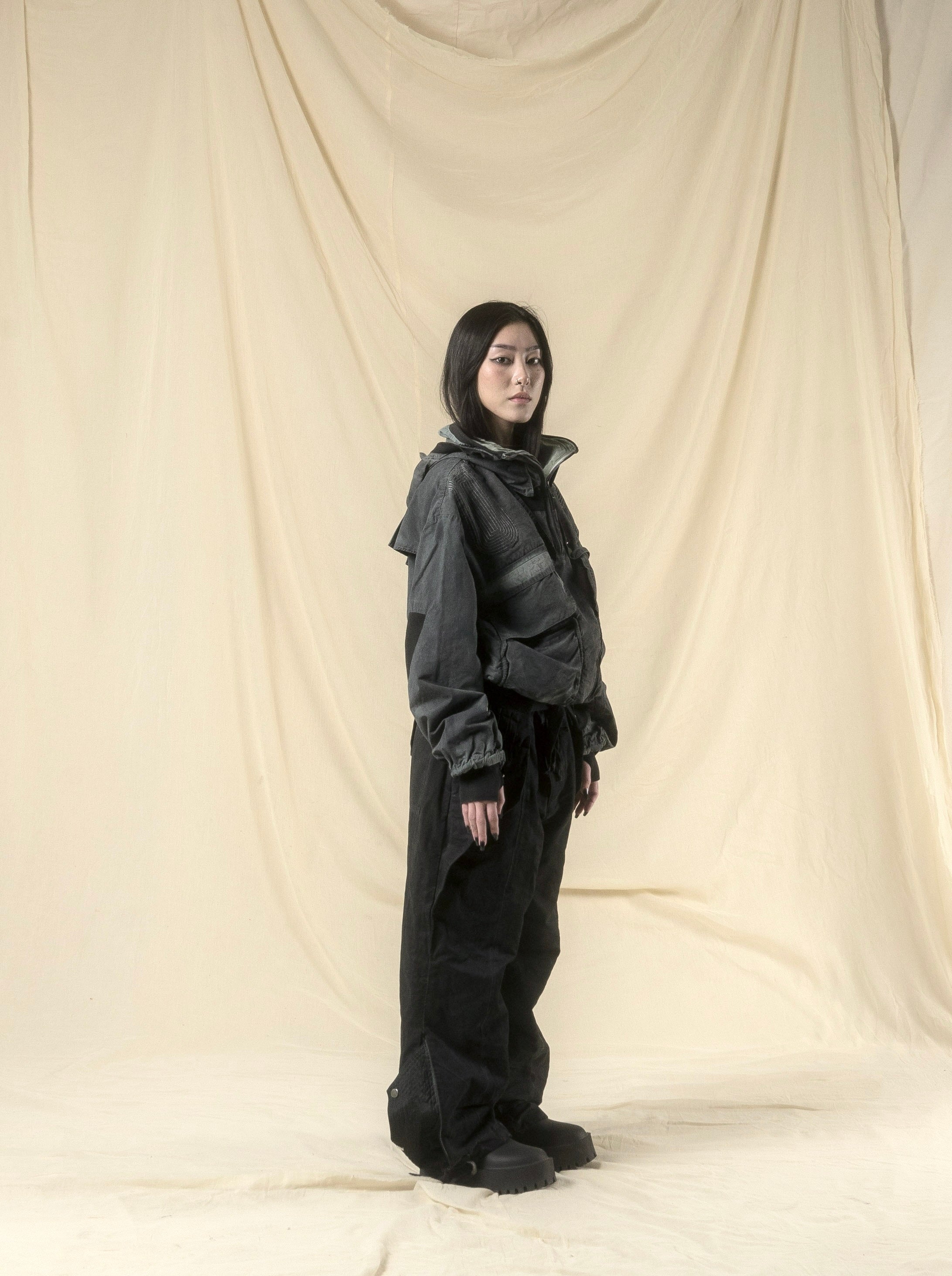 7-pocket quarter zip jacket. Fully adjustable cording throughout hems, hood, and sleeves. Ribbed cuffing and detail throughout entire shell. Nylon lining. Features piped seam detailing, layered vest paneling with snap closure, pleated wings, reverse 3D sleeve pocket, stitched shoulder patch, high neck collar, thumbholes and a brimmed hood. Finished with a hand pigmentation dye process in Los Angeles, CA and hand sewn label.